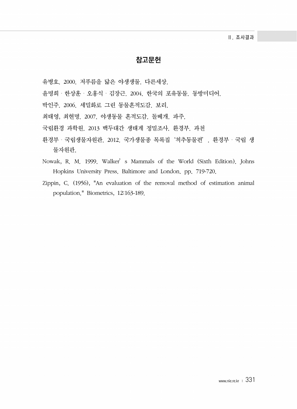 Ⅱ. 조사결과 www.nie.re.kr ? 331 참고문헌 유병호. 2000. 저푸름을 닮은 야생생물. 다른세상. 윤명희?한상훈?오홍식?김장근. 2004. 한국의 포유동물. 동방미디어. 박인주. 2006. 세밀화로 그린 동물흔적도감. 보리. 최태영, 최현명. 2007. 야생동물 흔적도감. 돌베개. 파주. 국립환경 과학원. 2013 백두대간 생태계 정밀조사. 환경부. 과천 환경부?국립생물자원관. 2012. 국가생물종 목록집‘척추동물편’. 환경부?국립 생 물자원관. Nowak, R. M. 1999. Walker’s Mammals of the World Sixth Edition Johns Hopkins University Press. Baltimore and London. pp. 719-720. Zippin, C...
