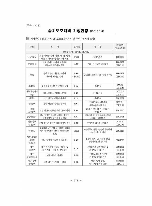 978 지역명 위 치 면적 ㎢ 특 징 지정일자 람사르등록 환경부 지정 23개소, 126.772㎢ 낙동강하구 부산 사하구 신평, 장림, 다대동 일원 해면 및 강서구 명지동 하단 해면 37.718 철새도래지 1999.08.09 대암산용늪 강원 인제군 서화면 대암산의 큰용늪과 작은용늪 일원 1.360 우리나라 유일의 고층습원 1999.08.09 `97.03.28 우포늪 경남 창녕군 대합면, 이방면, 유어면, 대지면 일원 8.609 개0.062 우리나라 최고 最古 의 원시 자연늪 1999.08.09 `98.03.02 무제치늪 울산 울주군 삼동면 조일리 일원 0.184 산지습지 1999.8.9 `07.12.20 제주 물영아리 오름 제주 서귀포시 남원읍 수망리 0.309 기생화산구 `06.10.18 2000.12.5 ...