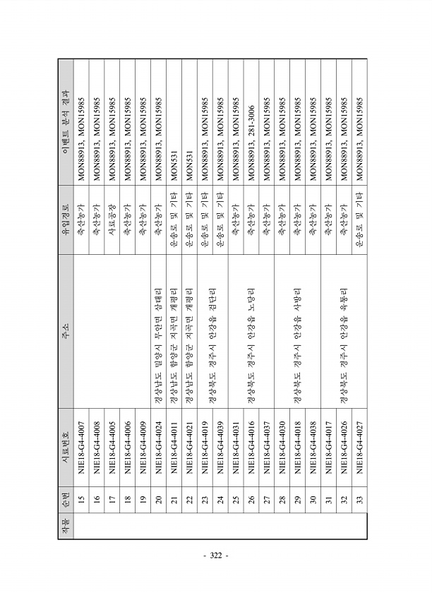 작물 순번 시료번호 주소 유입경로 이벤트 분석 결과 15 NIE18-G4-4007 축산농가 MON88913, MON15985 16 NIE18-G4-4008 축산농가 MON88913, MON15985 17 NIE18-G4-4005 사료공장 MON88913, MON15985 18 NIE18-G4-4006 축산농가 MON88913, MON15985 19 NIE18-G4-4009 축산농가 MON88913, MON15985 20 NIE18-G4-4024 경상남도 밀양시 무안면 삼태리 축산농가 MON88913, MON15985 21 NIE18-G4-4011 경상남도 함양군 지곡면 개평리 운송로 및 기타 MON531 22 NIE18-G4-4021 경상남도 함양군 지곡면 개평리 운송로 및 기타 MON531 23 NIE18...