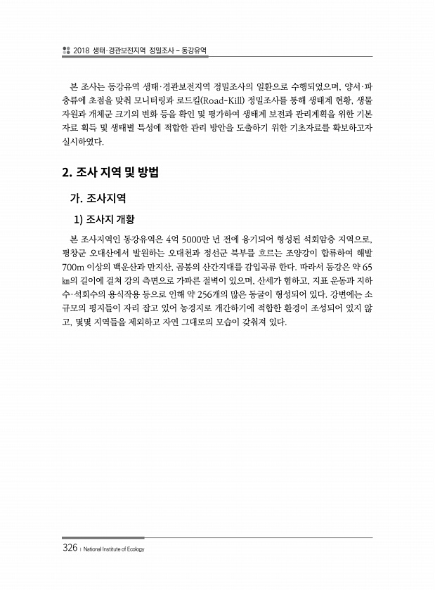 2018 생태·경관보전지역 정밀조사 동강유역 326 ? National Institute of Ecology 본 조사는 동강유역 생태·경관보전지역 정밀조사의 일환으로 수행되었으며, 양서·파 충류에 초점을 맞춰 모니터링과 로드킬 Road-Kill 정밀조사를 통해 생태계 현황, 생물 자원과 개체군 크기의 변화 등을 확인 및 평가하여 생태계 보전과 관리계획을 위한 기본 자료 획득 및 생태별 특성에 적합한 관리 방안을 도출하기 위한 기초자료를 확보하고자 실시하였다. 2. 1 본 조사지역인 동강유역은 4억 5000만 년 전에 융기되어 형성된 석회암층 지역으로, 평창군 오대산에서 발원하는 오대천과 정선군 북부를 흐르는 조양강이 합류하여 해발 700m 이상의 백운산과 만지산, 곰봉의 산간지대를 감입곡류 한다. 따라서 동...