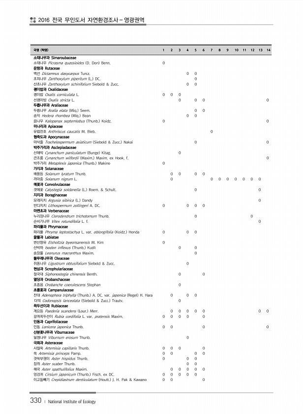 2016 전국 무인도서 자연환경조사 영광권역 330 ? National Institute of Ecology 국명 학명 1 2 3 4 5 6 7 8 9 10 11 12 13 14 소태나무과 Simaroubaceae 소태나무 Picrasma quassioides D. Don Benn. 0 운향과 Rutaceae 백선 Dictamnus dasycarpus Turcz. 0 0 초피나무 Zanthoxylum piperitum L. DC. 0 산초나무 Zanthoxylum schinifolium Siebold & Zucc. 0 0 괭이밥과 Oxalidaceae 괭이밥 Oxalis corniculata L. 0 0 0 선괭이밥 Oxalis stricta L. 0 0 0 0 두릅나무과 Araliaceae 두릅나무 Ara...