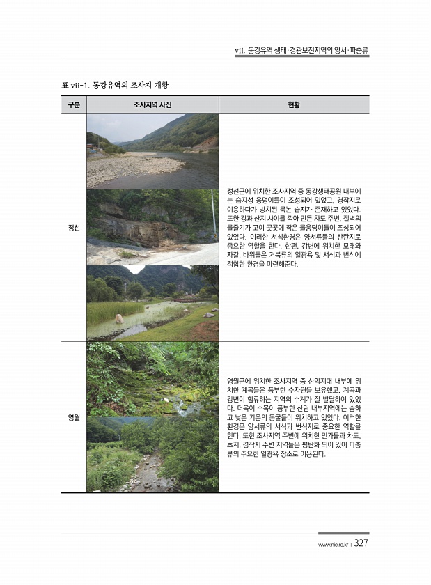 vii. 동강유역 생태·경관보전지역의 양서·파충류 www.nie.re.kr ?327 구분 조사지역 사진 현황 정선 정선군에 위치한 조사지역 중 동강생태공원 내부에 는 습지성 웅덩이들이 조성되어 있었고, 경작지로 이용하다가 방치된 묵논 습지가 존재하고 있었다. 또한 강과 산지 사이를 깎아 만든 차도 주변, 절벽의 물줄기가 고여 곳곳에 작은 물웅덩이들이 조성되어 있었다. 이러한 서식환경은 양서류들의 산란지로 중요한 역할을 한다. 한편, 강변에 위치한 모래와 자갈, 바위들은 거북류의 일광욕 및 서식과 번식에 적합한 환경을 마련해준다. 영월 영월군에 위치한 조사지역 중 산악지대 내부에 위 치한 계곡들은 풍부한 수자원을 보유했고, 계곡과 강변이 합류하는 지역의 수계가 잘 발달하여 있었 다. 더욱이 수목이 풍부한 산림...