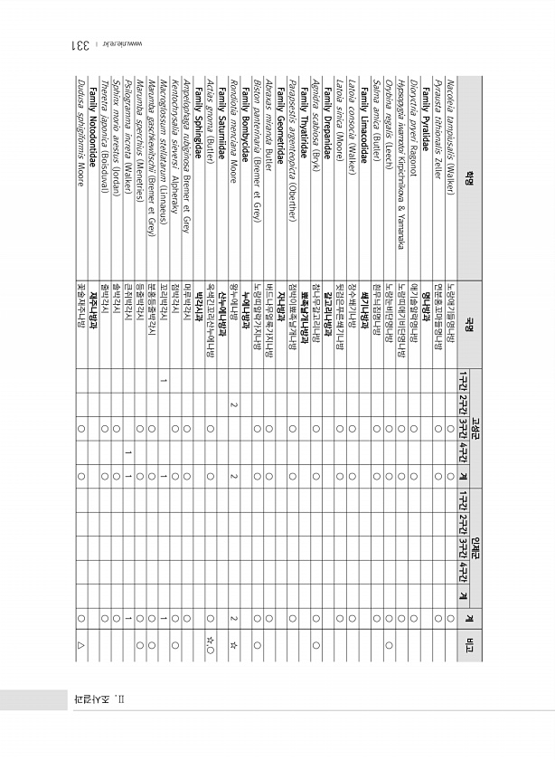331 학명 국명 고성군 인제군 계 비고 1구간 2구간 3구간 4구간 계 1구간 2구간 3구간 4구간 계 Nacoleia tampiusalis Walker 노랑애기들명나방 ○ ○ ○ Pyrausta tithionalis Zeller 연분홍꼬마들명나방 ○ ○ ○ Family Pyralidae 명나방과 Dioryctria pryeri Ragonot 애기솔알락명나방 ○ ○ ○ Hypsopygia iwamotoi Kirpichnikova & Yamanaka 노랑띠애기비단명나방 ○ ○ ○ Orybina regalis Leech 노랑눈비단명나방 ○ ○ ○ ○ Salma amica Butler 흰무늬집명나방 ○ ○ ○ Family Limacodidae 쐐기나방과 Latoia consocia Walker 장수쐐기나방 ○ ...