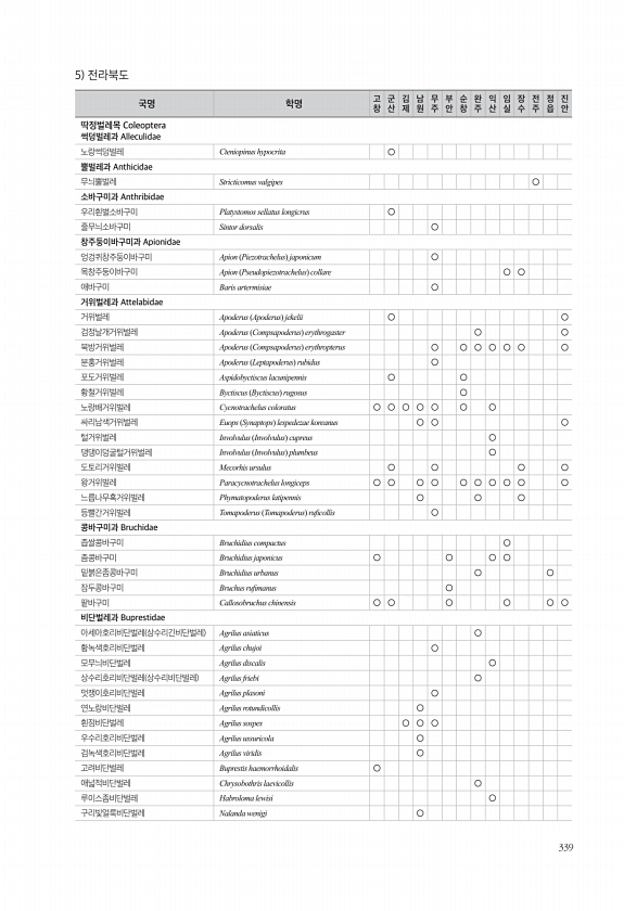 339 5 전라북도 국명 학명 고 창 군산 김제 남원 무주 부안 순창 완주 익산 임실 장수 전주 정읍 진안 딱정벌레목 Coleoptera 썩덩벌레과 Alleculidae 노랑썩덩벌레 Cteniopinus hypocrita ○ 뿔벌레과 Anthicidae 무늬뿔벌레 Stricticomus valgipes ○ 소바구미과 Anthribidae 우리흰별소바구미 Platystomos sellatus longicrus ○ 줄무늬소바구미 Sintor dorsalis ○ 창주둥이바구미과 Apionidae 엉겅퀴창주둥이바구미 Apion Piezotrachelus japonicum ○ 목창주둥이바구미 Apion Pseudopiezotrachelus collare ○ ○ 애바구미 Baris artermisiae ○ 거위벌레과 ...