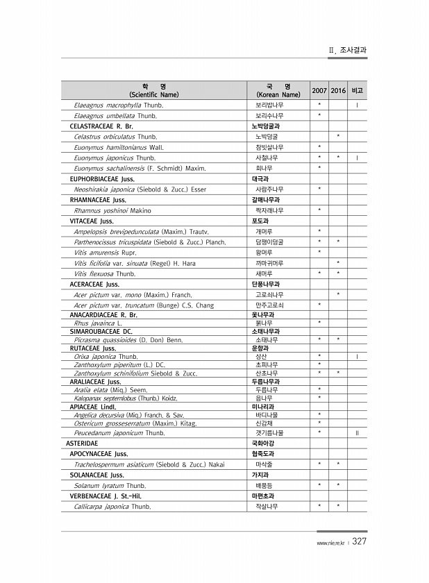 Ⅱ. 조사결과 www.nie.re.kr ? 327 학 명 Scientific Name 국 명 Korean Name 2007 2016 비고 Elaeagnus macrophylla Thunb. 보리밥나무 * Ⅰ Elaeagnus umbellata Thunb. 보리수나무 * CELASTRACEAE R. Br. 노박덩굴과 Celastrus orbiculatus Thunb. 노박덩굴 * Euonymus hamiltonianus Wall. 참빗살나무 * Euonymus japonicus Thunb. 사철나무 * * Ⅰ Euonymus sachalinensis F. Schmidt Maxim. 회나무 * EUPHORBIACEAE Juss. 대극과 Neoshirakia japonica Siebold & Zucc. Esser...
