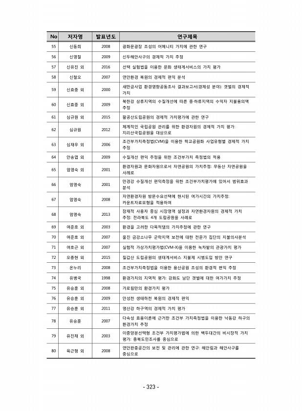 No 저자명 발표년도 연구제목 55 신동희 2008 광화문광장 조성의 어메니티 가치에 관한 연구 56 신영철 2009 신두해안사구의 경제적 가치 추정 57 신유진 외 2016 선택 실험법을 이용한 문화 생태계서비스의 가치 평가 58 신철오 2007 연안환경 복원의 경제적 편익 분석 59 신효중 외 2000 새만금사업 환경영향공동조사 결과보고서 경제성 분야 갯벌의 경제적 가치 60 신효중 외 2009 북한강 상류지역의 수질개선에 따른 중·하류지역의 수익자 지불용의액 추정 61 심규원 외 2015 팔공산도립공원의 경제적 가치평가에 관한 연구 62 심규원 2012 체계적인 국립공원 관리를 위한 환경자원의 경제적 가치 평가지리산국립공원을 대상으로 63 심재우 외 2006 조건부가치측정법 CVM 을 이용한 학교공원화...