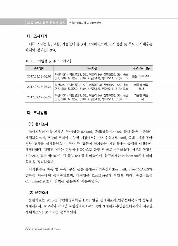 2017 DMZ 일원 생태계 조사 민통선이북지역 서부평야권역 330 ? National Institute of Ecology 나. 조사시기 어류 조사는 봄, 여름, 가을철에 총 3회 조사하였으며, 조사일정 및 주요 조사내용은 아래와 같다 표 96 조사일자 조사지점 주요 조사내용 2017.05.2806.02 덕산리 S1 , 덕현골 S2, S3 , 이길리 S4 , 산명호 S5, S6 , 동송 S7, S8 , 토교 S9, S10 , 사동 S12 , 빙애 S11, S13 코스 봄철 어류 조사 2017.07.1607.21 덕산리 S1 , 덕현골 S2, S3 , 이길리 S4 , 산명호 S5, S6 , 동송 S7, S8 , 토교 S9, S10 , 사동 S12 , 빙애 S11, S13 코스 여름철 어류 조사 2017.09...