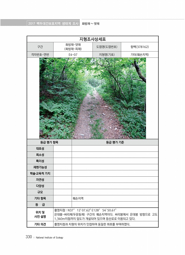 2017 백두대간보호지역 생태계 조사 화방재 댓재 330 ? National Institute of Ecology 지형조사상세표 구간 화방재댓재 화방재피재 도엽명 도엽번호 함백 378162 격자번호-연번 E4-07 지형명 기호 기타 훼손지역 등급 평가 항목 등급 평가 기준 대표성 희소성 특이성 재현가능성 학술?교육적 가치 자연성 다양성 규모 기타 항목 훼손지역 등 급 위치 및 사진 설명 촬영지점 N37° 1207.62E128° 5450.61은대봉싸리재 두문동재 구간의 훼손지역이다. 싸리봉에서 은대봉 방향으로 고도 1,340m지점까지 임도가 개설되어 있으며 등산로로 이용되고 있다. 기타 의견 촬영지점과 지형의 위치가 인접하여 동일한 좌표를부여하였다.