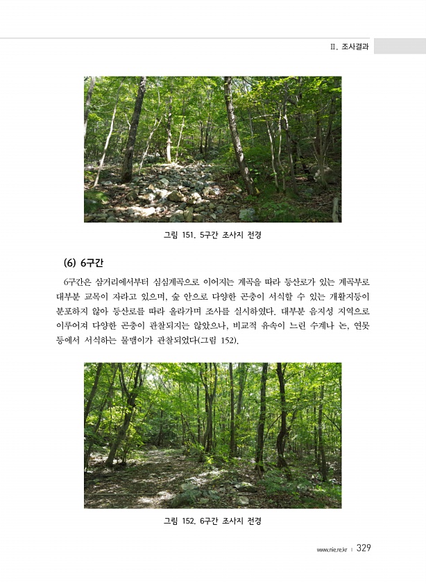 Ⅱ. 조사결과 www.nie.re.kr ? 329 그림 151. 5구간 조사지 전경 6 6구간 6구간은 삼거리에서부터 심심계곡으로 이어지는 계곡을 따라 등산로가 있는 계곡부로 대부분 교목이 자라고 있으며, 숲 안으로 다양한 곤충이 서식할 수 있는 개활지등이 분포하지 않아 등산로를 따라 올라가며 조사를 실시하였다. 대부분 음지성 지역으로 이루어져 다양한 곤충이 관찰되지는 않았으나, 비교적 유속이 느린 수계나 논, 연못 등에서 서식하는 물맴이가 관찰되었다 그림 152 그림 152. 6구간 조사지전경