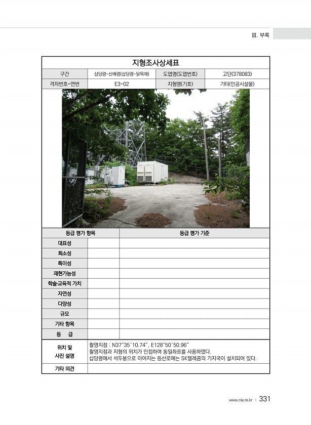 Ⅲ. 부록 www.nie.re.kr ? 331 지형조사상세표 구간 삽당령신배령 삽당령닭목재 도엽명 도엽번호 고단 378083 격자번호-연번 E3-02 지형명 기호 기타 인공시설물 등급 평가 항목 등급 평가 기준 대표성 희소성 특이성 재현가능성 학술?교육적 가치 자연성 다양성 규모 기타 항목 등 급 위치 및 사진 설명 촬영지점 N37°35′10.74″, E128°50′50.96″ 촬영지점과 지형의 위치가 인접하여 동일좌표를 사용하였다. 삽당령에서 석두봉으로 이어지는 등산로에는 SK텔레콤의 기지국이 설치되어 있다. 기타의견