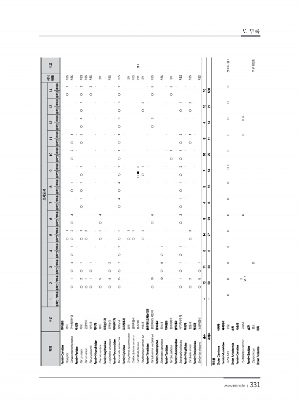 331 학명 국명 조사도서 서식 1 2 3 4 5 6 7 8 9 10 11 12 13 14 형태 비고 종확인 개체수 종확인 개체수 종확인 개체수 종확인 개체수 종확인 개체수 종확인 개체수 종확인 개체수 종확인 개체수 종확인 개체수 종확인 개체수 종확인 개체수 종확인 개체수 종확인 개체수 종확인 개체수 Family Corvidae 까마귀과 Pica pica 까치 ○ 1 ○ 1 RES Corvusmacrorhynchos 큰부리까마귀 ○ 1 ○ 4 ○ 1 ○ 2 ○ 3 ○ 1 ○ 2 ○ 1 RES Family Paridae 박새과 Parus major 박새 ○ 2 ○ 1 ○ 1 ○ 1 ○ 1 ○ 1 ○ 3 ○ 4 ○ 1 ○ 2 RES Parus varius 곤줄박이 ○ 1 ○ 2 RES Parus palustri...