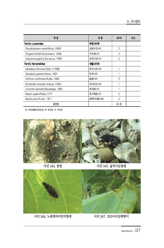 II. 조사결과 www.nie.re.kr ?327 학 명 국 명 2018 비고 Family Lycaenidae 부전나비과 Pseudozizeeria maha Kollar, 1848 남방부전나비 2 Tongeia fischeri Eversmann, 1843 먹부전나비 3 Celastrina argiolus Linnaeus, 1758 푸른부전나비 2 Family Nymphalidae 네발나비과 Mycalesis francisca Stoll, [1780] 부처사촌나비 1 Mycalesis gotama Moore, 1857 부처나비 1 Ypthima multistriata Butler, 1883 물결나비 3 Nymphalis canace Linnaeus, 1763 청띠신선나비 1 Limenitis doerriesi...