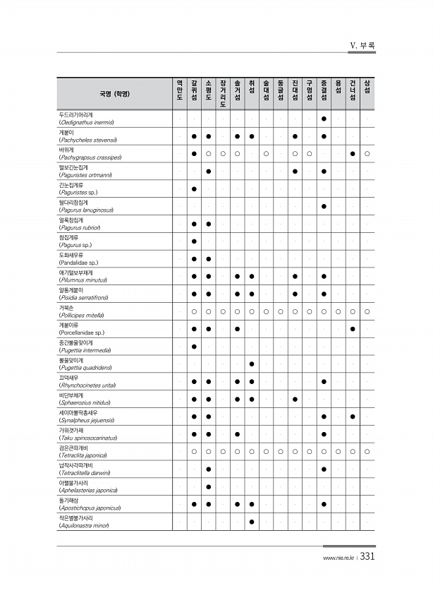 V. 부 록 www.nie.re.kr ?331 국명 학명 역만도 갈퀴섬 소평도 장거리도 솔거섬 취섬 술대섬 둥글섬 진대섬 구멍섬 중결섬 용섬 건너섬 상섬 두드러기어리게 Oedignathus inermis ● 게붙이 Pachycheles stevensii ● ● ● ● ● ● 바위게 Pachygrapsus crassipes ● ○ ○ ○ ○ ○ ○ ● ○ 털보긴눈집게 Paguristes ortmanni ● ● ● 긴눈집게류 Paguristes sp. ● 털다리참집게 Pagurus lanuginosus ...
