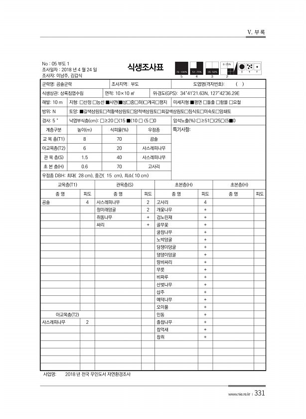V. 부 록 www.nie.re.kr ?331 No 05 부도 1 조사일자 2018 년 4 월 24 일 조사자이남주, 김갑식 식생조사표 군락명곰솔군락 조사지역부도 도엽명 격자번호 식생상관상록침엽수림 면적10×10 ㎡ 위?경도 GPS 34°4121.63N, 127°4236.29E 해발10 m 지형□산정 □능선 ■사면 ■상□중□하 □계곡□평지 미세지형■평면 □돌출 □함몰 □요철 방위N 토양■갈색삼림토□적황색삼림토□암적색삼림토□회갈색삼림토□침식토□미숙토□암쇄토 경사5 ° 낙엽부식층 cm □≥20 □ 15 ■ 10 □ 5 □0 암석노출 % □≥51□ 25□ 5■0 계층구분 높이 m 식피율 % 우점종 특기사항교 목 층 T1 8 70 곰솔 아교목층 T2 6 20 사스레피나무 관 목 층 S 1.5 40 사스레피나무 초 ...