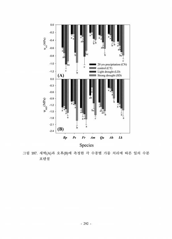 292 ? PD MPa -1.2 -1.0 -0.8 -0.6 -0.4 -0.2 0.0 20 yrs precipitation CN control CT Light drought LD Strong drought SD ab b bc a b b b c a a a ab bc c a b b a ab a a b bc a a ab c a A Species Bp Ps Fr Am Qa Ah Lk ? MD MPa -2.4 -2.1 -1.8 -1.5 -1.2 -0.9 -0.6 -0.3 0.0 a a a a a a a a b c a a a a ab a b a a bc a a a B a a ab b a ab 그림 187. 새벽 A 과 오후 B 에 측정한 각 수종별 가뭄 처리에 따른 잎의 수분포텐셜