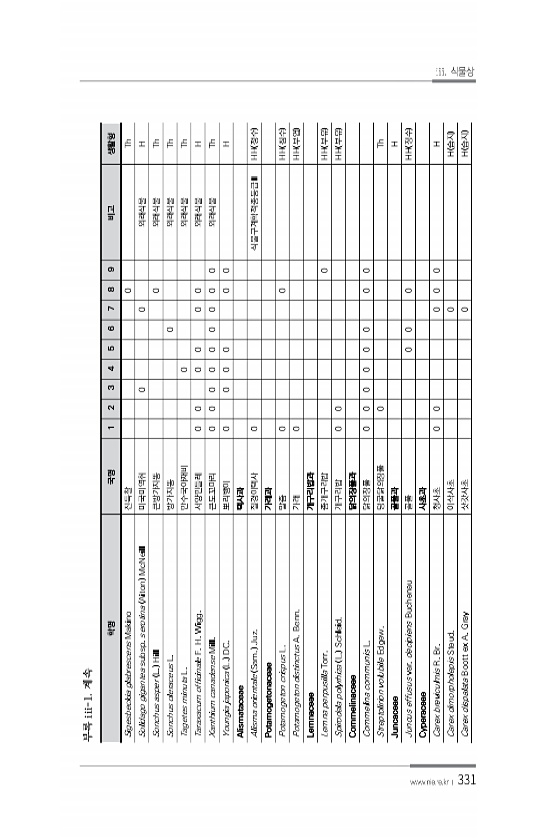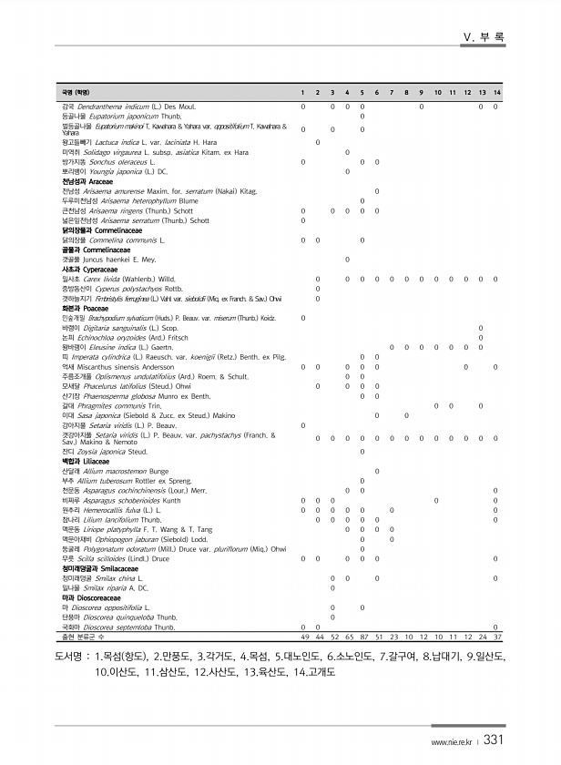 Ⅴ. 부 록 www.nie.re.kr ? 331 국명 학명 1 2 3 4 5 6 7 8 9 10 11 12 13 14 감국 Dendranthema indicum L. Des Moul. 0 0 0 0 0 0 0 등골나물 Eupatorium japonicum Thunb. 0 벌등골나물 Eupatorium makinoi T. Kawahara & Yahara var. oppositifolium T. Kawahara & Yahara 0 0 0 왕고들빼기 Lactuca indica L. var. laciniata H. Hara 0 미역취 Solidago virgaurea L. subsp. asiatica Kitam. ex Hara 0 방가지똥 Sonchus oleraceus L. 0 0 0 뽀리뱅이 Youngia ja...