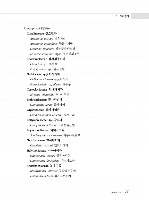 Ⅱ. 조사결과 www.nie.re.kr ? 331 Rhodophyta 홍조류 Corallinaceae 산호말과 Amphiroa anceps 넓은게발 Amphiroa ephedraea 둥근띠게발 Corallina pilulifera 작은구슬산호말 Crustose coralline algae 무절석회조류 Rhodomelaceae 빨간검둥이과 Chondria sp. 개서실류 Polysiphonia sp. 붉은실류 Gelidiaceae 우뭇가사리과 Gelidium elegans 우뭇가사리 Pterocladiella capillacea 개우무 Cystocloniaceae 열매가지과 Hypnea charoides 참가시우무 Endocladiaceae 풀가사리과 Gloiopeltis tenax 풀가사리 Gigartina...