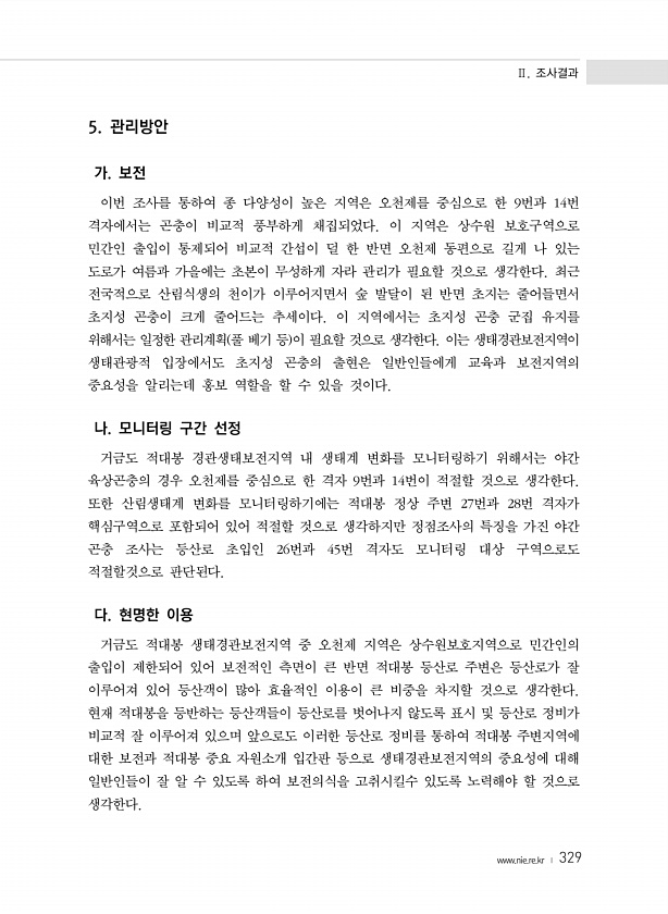 Ⅱ. 조사결과 www.nie.re.kr ? 329 5. 관리방안 가. 보전 이번 조사를 통하여 종 다양성이 높은 지역은 오천제를 중심으로 한 9번과 14번 격자에서는 곤충이 비교적 풍부하게 채집되었다. 이 지역은 상수원 보호구역으로 민간인 출입이 통제되어 비교적 간섭이 덜 한 반면 오천제 동편으로 길게 나 있는 도로가 여름과 가을에는 초본이 무성하게 자라 관리가 필요할 것으로 생각한다. 최근 전국적으로 산림식생의 천이가 이루어지면서 숲 발달이 된 반면 초지는 줄어들면서 초지성 곤충이 크게 줄어드는 추세이다. 이 지역에서는 초지성 곤충 군집 유지를 위해서는 일정한 관리계획 풀 베기 등 이 필요할 것으로 생각한다. 이는 생태경관보전지역이 생태관광적 입장에서도 초지성 곤충의 출현은 일반인들에게 교육과 보전지역의 ...