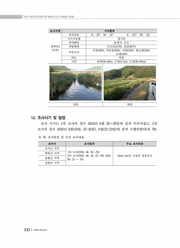 2016 백두대간보호지역 생태계 조사 추풍령밀재 330Ⅰwww.nie.re.kr 조사지점 서식환경 청화산2 중류 위치정보 N 36° 36′ 33″ E 127° 59′ 43″ 서식지유형 평지천 유역환경 농경지, 도로 제방형태 콘크리트 좌 , 돌망태 우 하상구조 큰돌 40% , 작은돌 20% , 자갈 20% , 왕모래 10% , 모래 10% 탁도 탁함 기타 하폭 3040m , 수폭 35m , 수심 3050cm 상류 하류 나. 조사시기 및 일정 조사 시기는 1차 조사의 경우 2016년 6월 26∼29일에 걸쳐 이루어졌고, 2차 조사의 경우 2016년 8월 10일, 2526일 , 9월 2223일 에 걸쳐 수행하였다 표 70 조사지 조사일자 주요 조사내용 웅이산 지역 1차 조사 2016. 06. 26∼29 2차 조사...