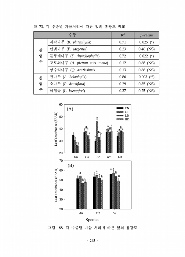 293 수종 R2 p-value 활 엽 수 자작나무 B. platyphylla 0.71 0.025 * 산벚나무 P. sargentii 0.23 0.46 NS 물푸레나무 F. rhynchophylla 0.72 0.022 * 고로쇠나무 A. pictum sub. mono 0.12 0.68 NS 상수리나무 Q. acutissima 0.13 0.66 NS 침 엽 수 전나무 A. holophylla 0.86 0.003 ** 소나무 P. densiflora 0.29 0.35 NS 낙엽송 L. kaempferi 0.37 0.25 NS 표 73. 각 수종별 가뭄처리에 따른 잎의 흡광도 비교 Bp Ps Fr Am Qa Leaf absorbance SPAD 20 30 40 50 60 CN CT LD HD Species Ah ...