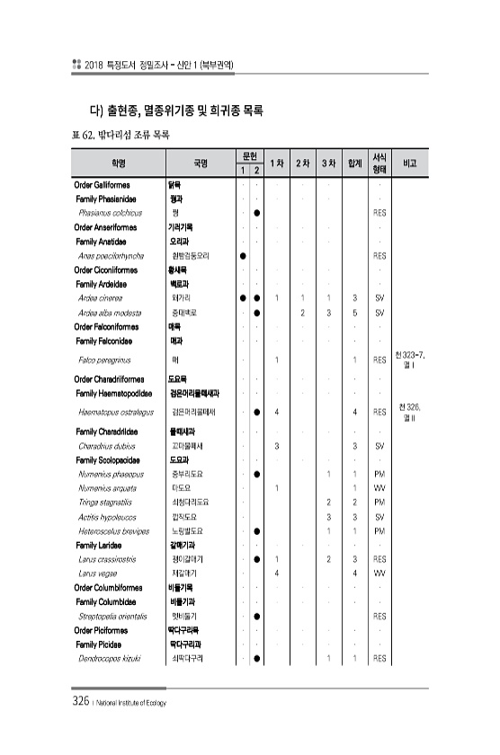 2018 특정도서 정밀조사 신안 1 북부권역 326 ? National Institute of Ecology , 학명 국명 문헌 1 차 2 차 3 차 합계 서식 1 2 형태 비고 Order Galliformes 닭목 Family Phasianidae 꿩과 Phasianus colchicus 꿩 ● RES Order Anseriformes 기러기목 Family Anatidae 오리과 Anas poecilorhyncha 흰뺨검둥오리 ● RES Order Ciconiiformes 황새목 Family Ardeidae 백로과 Ardea cinerea 왜가리 ● ● 1 1 1 3 SV Ardea alba modesta 중대백로 ● 2 3 5 SV Order Falconiformes 매목 Family Falcon...