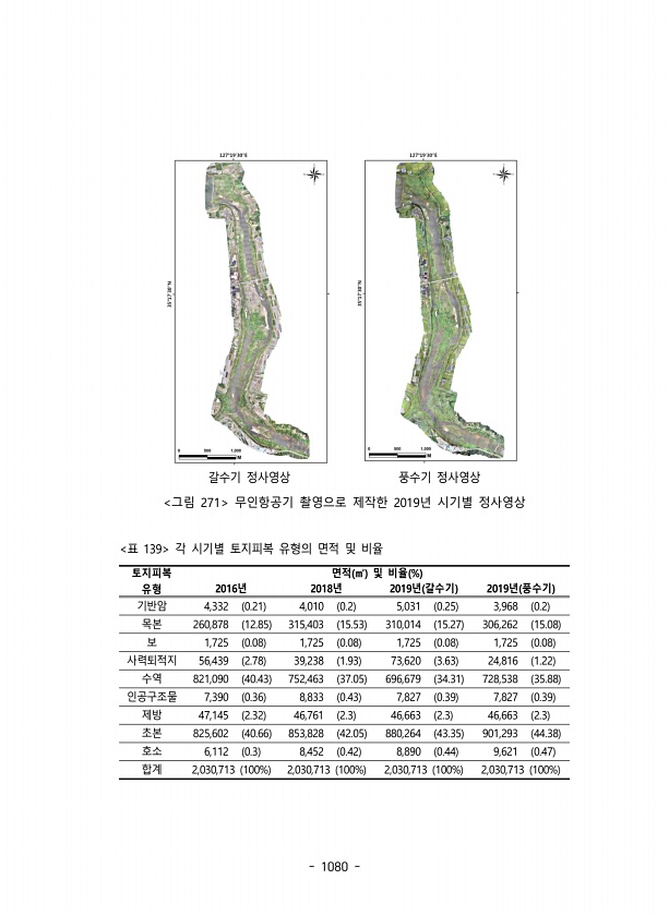 1080 갈수기 정사영상 풍수기 정사영상 그림 271 무인항공기 촬영으로 제작한 2019년 시기별 정사영상 토지피복 유형 면적 ㎡ 및 비율 % 2016년 2018년 2019년 갈수기 2019년 풍수기 기반암 4,332 0.21 4,010 0.2 5,031 0.25 3,968 0.2 목본 260,878 12.85 315,403 15.53 310,014 15.27 306,262 15.08 보 1,725 0.08 1,725 0.08 1,725 0.08 1,725 0.08 사력퇴적지 56,439 2.78 39,238 1.93 73,620 3.63 24,816 1.22 수역 821,090 40.43 752,463 37.05 696,679 34.31 728,538 35.88 인공구조물 7,390 0.36 8,833 0...