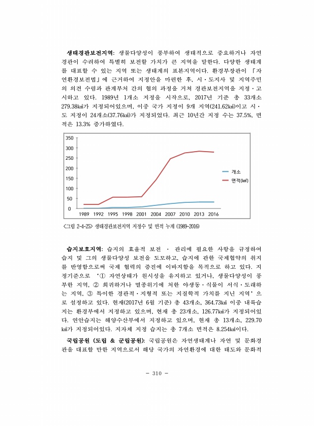 310 생태경관보전지역생물다양성이 풍부하여 생태적으로 중요하거나 자연 경관이 수려하여 특별히 보전할 가치가 큰 지역을 말한다. 다양한 생태계 를 대표할 수 있는 지역 또는 생태계의 표본지역이다. 환경부장관이 「자 연환경보전법」에 근거하여 지정안을 마련한 후, 시·도지사 및 지역주민 의 의견 수렴과 관계부처 간의 협의 과정을 거쳐 경관보전지역을 지정·고 시하고 있다. 1989년 1개소 지정을 시작으로, 2017년 기준 총 33개소 279.38㎢가 지정되어있으며, 이중 국가 지정이 9개 지역 241.62㎢ 이고 시· 도 지정이 24개소 37.76㎢ 가 지정되었다. 최근 10년간 지정 수는 37.5%, 면 적은 13.3% 증가하였다. 0 50 100 150 200 250 300 350 1989 1992 1995 ...