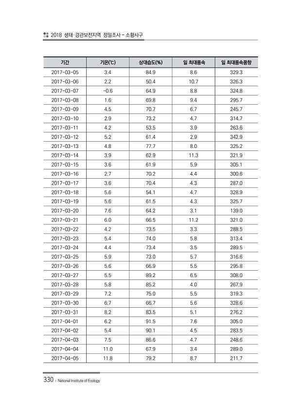 2018 생태·경관보전지역 정밀조사 소황사구 330 ? National Institute of Ecology 기간 기온 ℃ 상대습도 % 일 최대풍속 일 최대풍속풍향 2017-03-05 3.4 84.9 8.6 329.3 2017-03-06 2.2 50.4 10.7 326.3 2017-03-07 -0.6 64.9 8.8 324.8 2017-03-08 1.6 69.8 9.4 295.7 2017-03-09 4.5 70.7 6.7 245.7 2017-03-10 2.9 73.2 4.7 314.7 2017-03-11 4.2 53.5 3.9 263.6 2017-03-12 5.2 61.4 2.9 342.9 2017-03-13 4.8 77.7 8.0 325.2 2017-03-14 3.9 62.9 11.3 321.9 2017-...