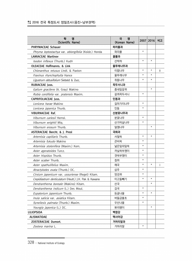 2016 전국 특정도서 정밀조사 옹진-남부권역 328 ? National Institute of Ecology 학 명 Scientific Name 국 명 Korean Name 2007 2016 비고 PHRYMACEAE Schauer 파리풀과 Phryma leptostachya var. oblongifolia Koidz. Honda 파리풀 * LAMIACEAE Martinov 꿀풀과 Isodon inflexus Thunb. Kud? 산박하 * * OLEACEAE Hoffmanns. & Link 물푸레나무과 Chionanthus retusus Lindl. & Paxton 이팝나무 * * Ⅱ Fraxinus rhynchophylla Hance 물푸레나무 * * Ligustrum obtusifolium Siebol...
