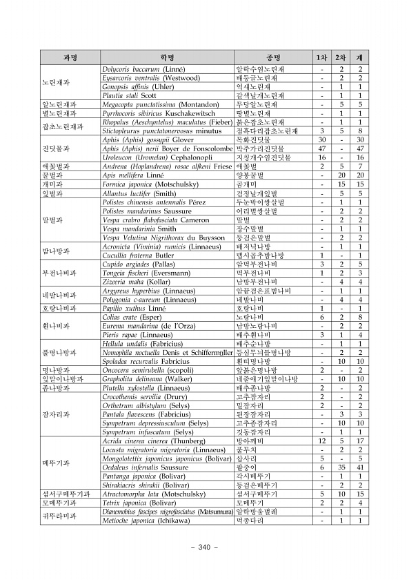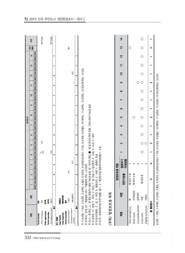 332 주 1 도서명 1.목도, 2.하계도, 3.상계도, 4.홍도, 5.하과도, 6.상파도 상과도 , 7.치도, 8.소락도, 9.만월도, 10.대락도, 11.납계도, 12.모개도, 13.토도 복개도 , 14.단도 주 2 RES 텃새, SV 여름철새, WV 겨울철새, PM 나그네새 주 3 ○ 종 확인, △ 종 확인 못했으나 출현 가능성 높음, ◎ 번식지 확인, ■ 종 및 번식지 확인 못함. 그러나 번식 가능성 높음 주 4 포유류 D 분변, F 족적, V 목견, T 굴, 터널, E 섭식흔적, K 사체, S 소리, Y 새끼 주 5 양서?파충류 E 알, V 목견, S 울음소리, K 사체, Y 올챙이, 유생 주 6 천 문화재청지정 천연기념물, 멸Ⅰ, Ⅱ 환경부지정 멸종위기야생생물Ⅰ, Ⅱ급 학명 국명 법정보호종 현황 ...