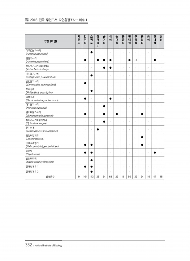 2018 전국 무인도서 자연환경조사 여수 1 332 ? National Institute of Ecology 국명 학명 역만도 갈퀴섬 소평도 장거리도 솔거섬 취섬 술대섬 둥글섬 진대섬 구멍섬 중결섬 용섬 건너섬 상섬 아무르불가사리 Asterias amurensis ● 별불가사리 Asterina pectinifera ● ● ● ● ● ○ ● 루드윅가지거미불가사리 Astrocladus ludwigi ● ● 가시불가사리 Astropecten polyacanthus ● 빨강불가사리 Certonardoa semiregularis ● ...
