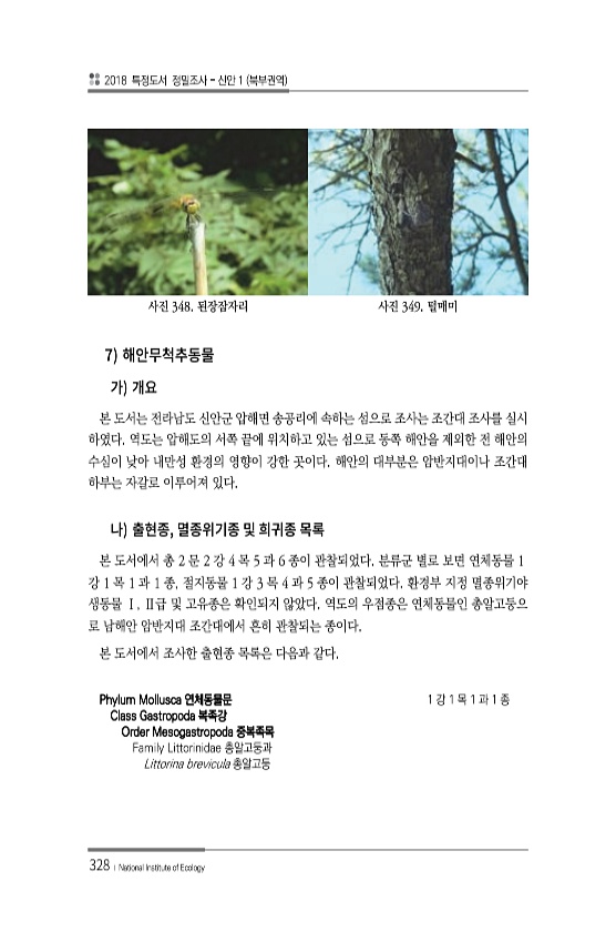2018 특정도서 정밀조사 신안 1 북부권역 328 ? National Institute of Ecology 7 본 도서는 전라남도 신안군 압해면 송공리에 속하는 섬으로 조사는 조간대 조사를 실시 하였다. 역도는 압해도의 서쪽 끝에 위치하고 있는 섬으로 동쪽 해안을 제외한 전 해안의 수심이 낮아 내만성 환경의 영향이 강한 곳이다. 해안의 대부분은 암반지대이나 조간대 하부는 자갈로 이루어져 있다. , 본 도서에서 총 2 문 2 강 4 목 5 과 6 종이 관찰되었다. 분류군 별로 보면 연체동물 1 강 1 목 1 과 1 종, 절지동물 1 강 3 목 4 과 5 종이 관찰되었다. 환경부 지정 멸종위기야 생동물 Ⅰ, Ⅱ급 및 고유종은 확인되지 않았다. 역도의 우점종은 연체동물인 총알고둥으 로 남해안 암반지대 조간대에서...