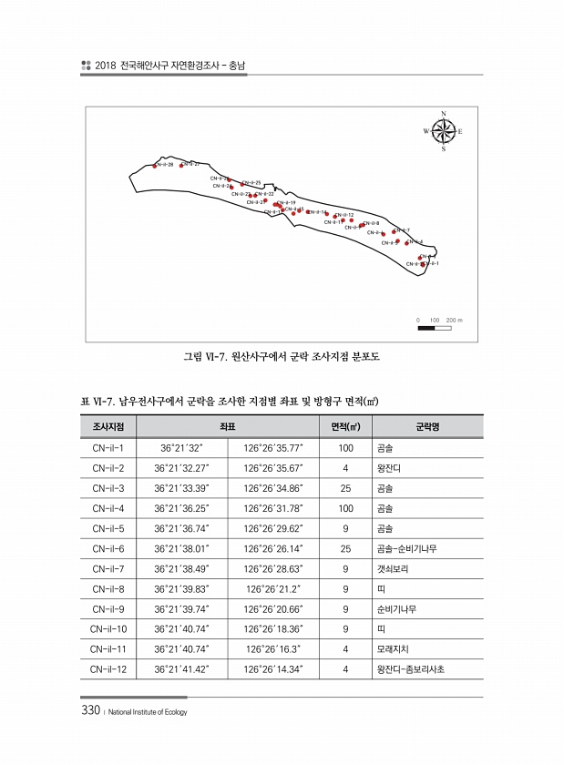 2018 전국해안사구 자연환경조사 충남 330 ? National Institute of Ecology 그림 Ⅵ-7. 원산사구에서 군락 조사지점 분포도 조사지점 좌표 면적 ㎡ 군락명 CN-il-1 36°21′32″ 126°26′35.77″ 100 곰솔 CN-il-2 36°21′32.27″ 126°26′35.67″ 4 왕잔디 CN-il-3 36°21′33.39″ 126°26′34.86″ 25 곰솔 CN-il-4 36°21′36.25″ 126°26′31.78″ 100 곰솔 CN-il-5 36°21′36.74″ 126°26′29.62″ 9 곰솔 CN-il-6 36°21′38.01″ 126°26′26.14″ 25 곰솔-순비기나무 CN-il-7 36°21′38.49″ 126°26′28.63″ 9 갯쇠보리 CN-il-...