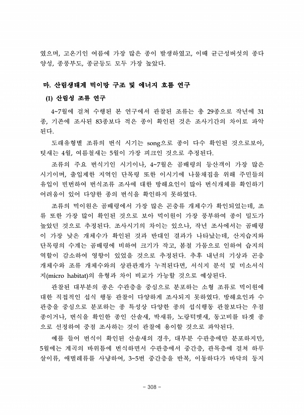 였으며, 고온기인 여름에 가장 많은 종이 발생하였고, 이때 균근성버섯의 종다 양성, 종풍부도, 종균등도 모두 가장 높았다. 마. 산림생태계 먹이망 구조 및 에너지 흐름 연구 1 산림성 조류 연구 47월에 걸쳐 수행된 본 연구에서 관찰된 조류는 총 29종으로 작년에 31 종, 기존에 조사된 83종보다 적은 종이 확인된 것은 조사기간의 차이로 파악 된다. 도래유형별 조류의 번식 시기는 song으로 종이 다수 확인된 것으로보아, 텃새는 4월, 여름철새는 5월이 가장 피크인 것으로 추정된다. 조류의 주요 번식기인 시기이나, 47월은 곰배령의 등산객이 가장 많은 시기이며, 출입제한 지역인 단목령 또한 이시기에 나물채집을 위해 주민들의 유입이 빈번하여 번식조류 조사에 대한 방해요인이 많아 번식개체를 확인하기 어려움이 ...