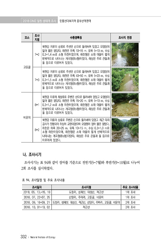 2018 DMZ 일원 생태계 조사 민통선이북지역 중부산악권역 332 ? National Institute of Ecology 코스 조사 지점 수환경특징 조사지 전경 고둔골 7-2 북한강 지류의 상류로 주변은 산으로 둘러싸여 있었고 오염원이 없어 물은 맑았다. 하천은 하폭 1015 m, 유폭 510 m, 수심 0.31.4 m로 소형 하천이었으며, 하천형은 소와 여울이 짧게 반복적으로 나타나는 계곡형 Bb형 이었다. 하상은 주로 큰돌과 돌 등으로 이루어져 있었다. 7-3 북한강 지류의 상류로 주변은 산으로 둘러싸여 있었고 오염원이 없어 물은 맑았다. 하천은 하폭 4050 m, 유폭 520 m, 수심 0.31.5 m로 소형 하천이었으며, 하천형은 소와 여울이 짧게 반복적으로 나타나는 계곡형 Bb형 이었다. 하상은...