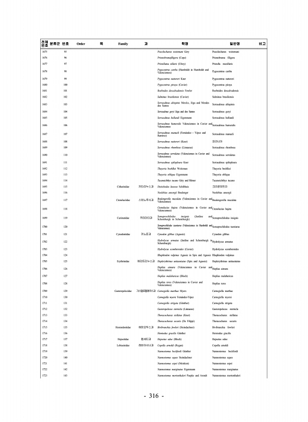 316 전체 번호 분류군 번호 Order 목 Family 과 학명 일반명 비고 1675 95 Poecilocharax weitzmani G?ry Poecilocharax weitzmani 1676 96 Prionobramafiligera Cope Prionobrama filigera 1677 97 Pristellama xillaris Ulrey Pristella maxillaris 1678 98 Pygocentrus cariba Humboldt in Humboldt and Valenciennes Pygocentrus cariba 1679 99 Pygocentrus nattereri Kner Pygocentrus nattereri 1680 100 Pygocentrus piraya Cuvier Pygocentr...