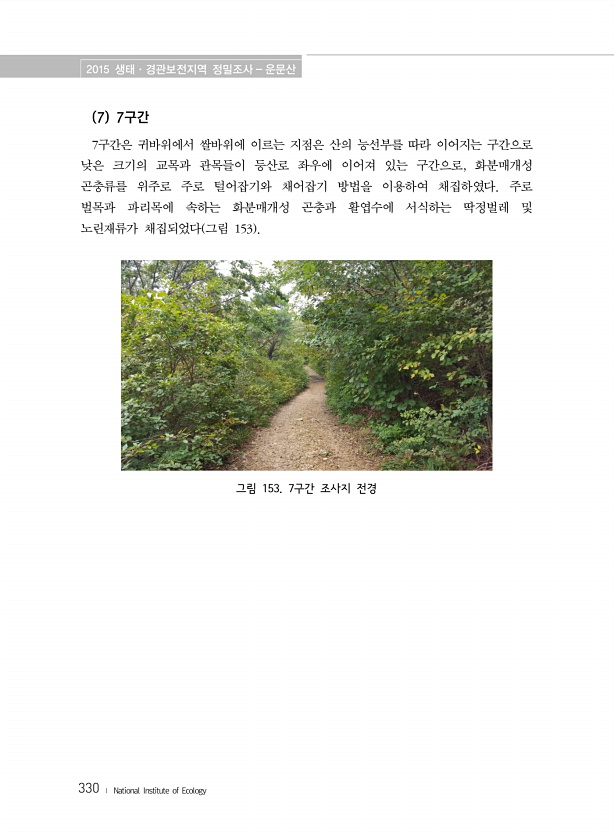 2015 생태·경관보전지역 정밀조사 운문산 330 ? National Institute of Ecology 7 7구간 7구간은 귀바위에서 쌀바위에 이르는 지점은 산의 능선부를 따라 이어지는 구간으로 낮은 크기의 교목과 관목들이 등산로 좌우에 이어져 있는 구간으로, 화분매개성 곤충류를 위주로 주로 털어잡기와 채어잡기 방법을 이용하여 채집하였다. 주로 벌목과 파리목에 속하는 화분매개성 곤충과 활엽수에 서식하는 딱정벌레 및 노린재류가 채집되었다 그림 153 그림 153. 7구간 조사지전경