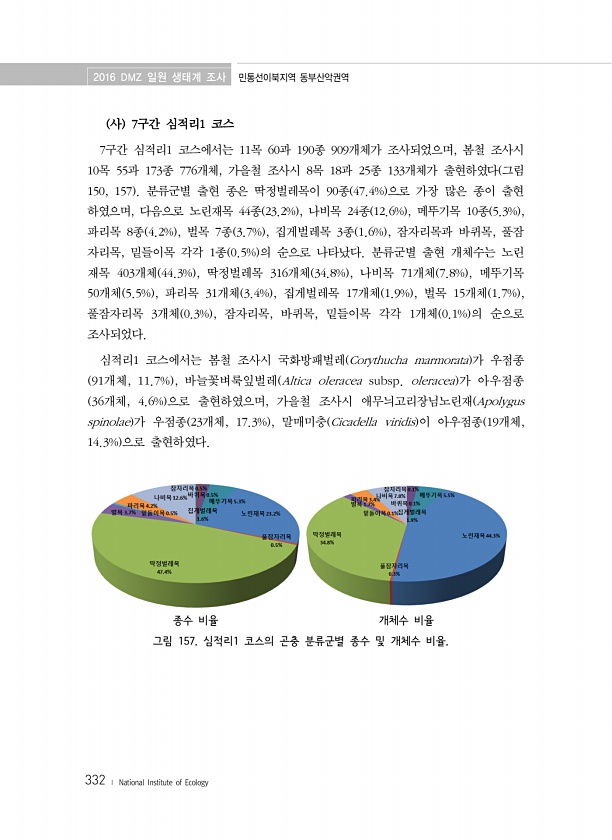 2016 DMZ 일원 생태계 조사 민통선이북지역 동부산악권역 332 ? National Institute of Ecology 사 7구간 심적리1 코스 7구간 심적리1 코스에서는 11목 60과 190종 909개체가 조사되었으며, 봄철 조사시 10목 55과 173종 776개체, 가을철 조사시 8목 18과 25종 133개체가 출현하였다 그림 150, 157 분류군별 출현 종은 딱정벌레목이 90종 47.4% 으로 가장 많은 종이 출현 하였으며, 다음으로 노린재목 44종 23.2% , 나비목 24종 12.6% , 메뚜기목 10종 5.3% , 파리목 8종 4.2% , 벌목 7종 3.7% , 집게벌레목 3종 1.6% , 잠자리목과 바퀴목, 풀잠 자리목, 밑들이목 각각 1종 0.5% 의 순으로 나타났다. 분류군별 출현 개...