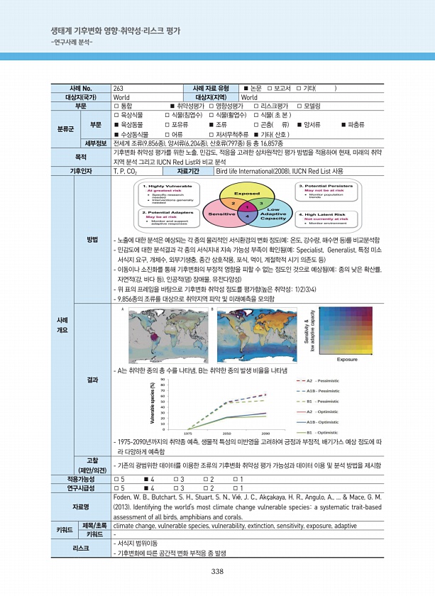 338 생태계 기후변화 영향·취약성·리스크 평가 -연구사례 분석- 사례 No. 263 사례 자료 유형 ■ 논문 □ 보고서 □ 기타 대상지 국가 World 대상지 지역 World 부문 □ 통합 ■ 취약성평가 □ 영향성평가 □ 리스크평가 □ 모델링 분류군 부문 □ 육상식물 □ 식물 침엽수 □ 식물 활엽수 □ 식물 초 본 ■ 육상동물 □ 포유류 ■ 조류 □ 곤충 류 ■ 양서류 ■ 파충류 ■ 수상동식물 □ 어류 □ 저서무척추류 ■ 기타 산호 세부정보 전세계 조류 9,856종 , 양서류 6,204종 , 산호류 797종 등 총 16,857종 목적 기후변화 취약성 평가를 위한 노출, 민감도, 적응을 고려한 삼차원적인 평가 방법을 적용하여 현재, 미래의 취약 지역 분석 그리고 IUCN Red List와 비교 분석 기후인자...