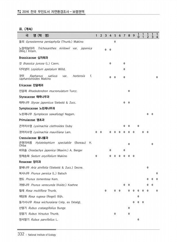 2016 전국 무인도서 자연환경조사 보령권역 332 ? National Institute of Ecology 표. 계속 국 명 학 명 1 2 3 4 5 6 7 8 9 1 0 1 1 1 2 1 3 1 4 돌외 Gynostemma pentaphylla Thunb. Makino 0 노랑하늘타리 Trichosanthes kirilowii var. japonica Miq. Kitam. 0 0 Brassicaceae 십자화과 갓 Brassica juncea L. Czern. 0 0 다닥냉이 Lepidium apetalum Willd. 0 갯무 Raphanus sativus var. hortensis f. raphanistroides Makino 0 0 0 0 Ericaceae 진달래과 진달래 Rhododendron m...