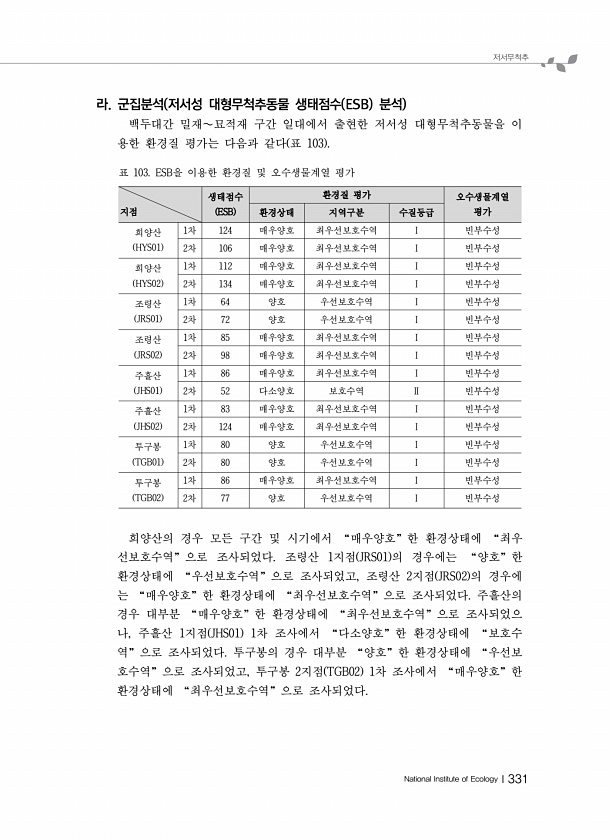 저서무척추 National Institute of EcologyⅠ331 라. 군집분석 저서성 대형무척추동물 생태점수 ESB 분석 백두대간 밀재∼묘적재 구간 일대에서 출현한 저서성 대형무척추동물을 이 용한 환경질 평가는 다음과 같다 표 103 지점 생태점수 ESB 환경질 평가 오수생물계열 환경상태 지역구분 수질등급 평가 희양산 HYS01 1차 124 매우양호 최우선보호수역 I 빈부수성 2차 106 매우양호 최우선보호수역 I 빈부수성 희양산 HYS02 1차 112 매우양호 최우선보호수역 I 빈부수성 2차 134 매우양호 최우선보호수역 I 빈부수성 조령산 JRS01 1차 64 양호 우선보호수역 I 빈부수성 2차 72 양호 우선보호수역 I 빈부수성 조령산 JRS02 1차 85 매우양호 최우선보호수역 I 빈부수성 2...