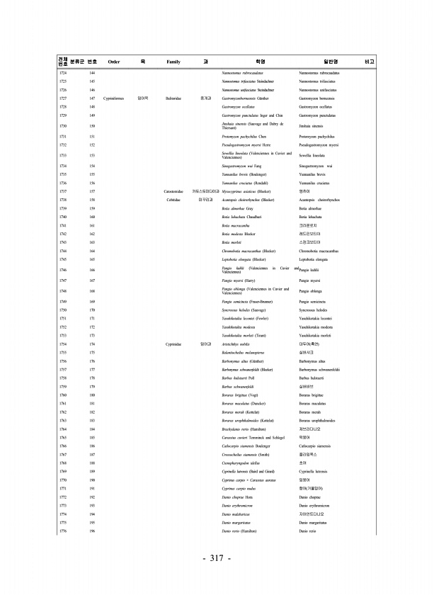 317 전체 번호 분류군 번호 Order 목 Family 과 학명 일반명 비고 1724 144 Nannostomus rubrocaudatus Nannostomus rubrocaudatus 1725 145 Nannostomus trifasciatus Steindachner Nannostomus trifasciatus 1726 146 Nannostomus unifasciatus Steindachner Nannostomus unifasciatus 1727 147 Cypriniformes 잉어목 Balitoridae 종개과 Gastromyzonborneensis G?nther Gastromyzon borneensis 1728 148 Gastromyzon ocellatus Gastromyzon ocellatus 17...
