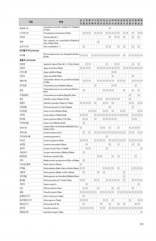 339 흰층꽃나무 Caryopteris incana for. candida C.K. Schneid. H. Hara ○ 누리장나무 Clerodendrum trichotomum Thunb. ○ ○ ○ ○ ○ ○ ○ ○ ○ ○ ○ ○ ○ ○ ○ ○ 마편초 Verbena offcalis L. ○ ○ ○ ○ ○ ○ 목형 Vitex negundo var. cannabifolia Siebold & Zucc. Hand.-Mazz. ○ 순비기나무 Vitex rotundifolia L. f. ○ ○ ○ ○ ○ ○ ○ 파리풀과 Phrymaceae 파리풀 Phryma leptostachya var. oblongifolia Koidz. Honda ○ ○ ○ ○ ○ ○ ○ ○ ○ ○ ○ ○ ○ ○ ○ ○ ○ ○ ○ 꿀풀과 Lamia...