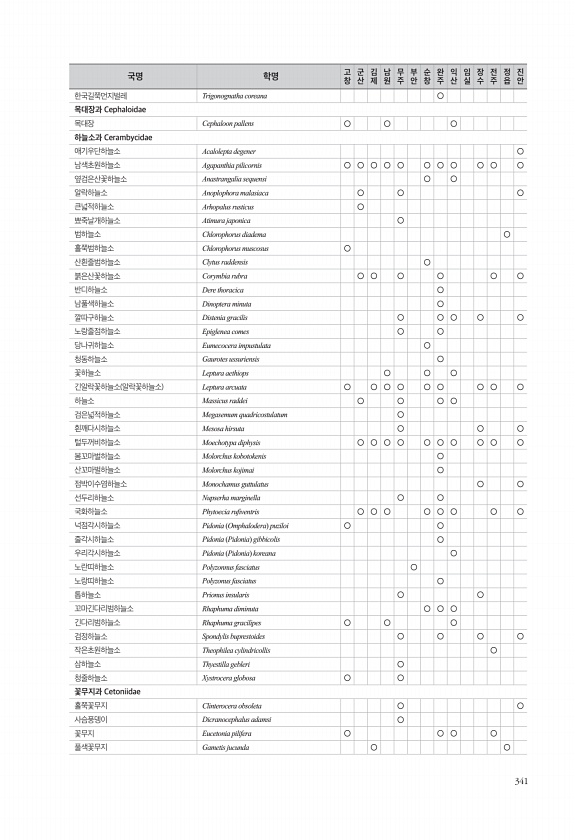 341 한국길쭉먼지벌레 Trigonognatha coreana ○ 목대장과 Cephaloidae 목대장 Cephaloon pallens ○ ○ ○ 하늘소과 Cerambycidae 애기우단하늘소 Acalolepta degener ○ 남색초원하늘소 Agapanthia pilicornis ○ ○ ○ ○ ○ ○ ○ ○ ○ ○ ○ 옆검은산꽃하늘소 Anastrangalia sequensi ○ ○ 알락하늘소 Anoplophora malasiaca ○ ○ ○ 큰넓적하늘소 Arhopalus rusticus ○ 뾰죽날개하늘소 Atimura japonica ○ 범하늘소 Chlorophorus diadema ○ 홀쭉범하늘소 Chlorophorus muscosus ○ 산흰줄범하늘소 Clytus raddensis ○ 붉은산꽃하늘소 ...