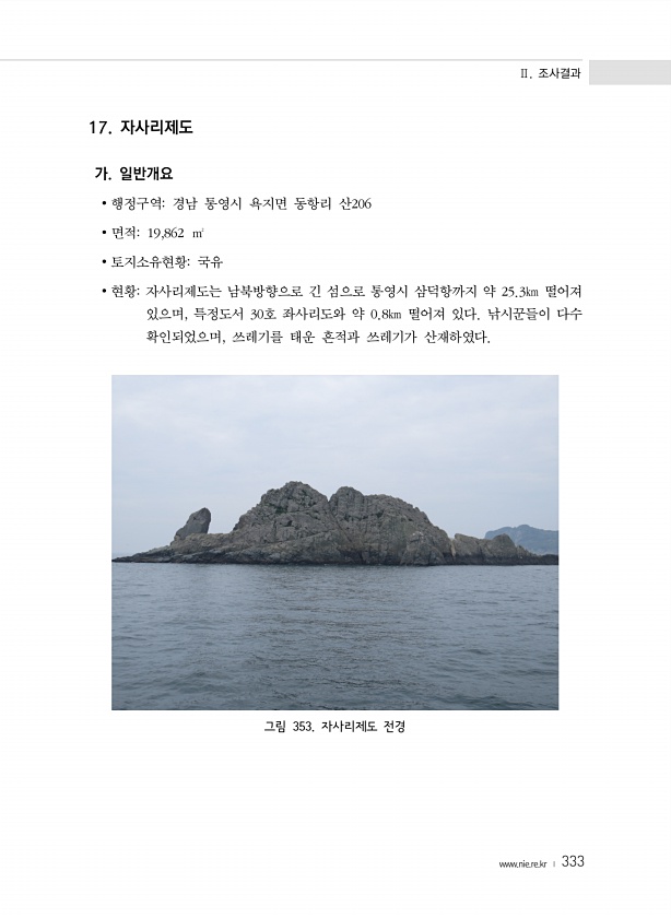 Ⅱ. 조사결과 www.nie.re.kr ? 333 17. 자사리제도 가. 일반개요 ? 행정구역경남 통영시 욕지면 동항리 산206 ? 면적19,862 ㎡ ? 토지소유현황국유 ? 현황자사리제도는 남북방향으로 긴 섬으로 통영시 삼덕항까지 약 25.3㎞ 떨어져 있으며, 특정도서 30호 좌사리도와 약 0.8㎞ 떨어져 있다. 낚시꾼들이 다수 확인되었으며, 쓰레기를 태운 흔적과 쓰레기가 산재하였다. 그림 353. 자사리제도전경