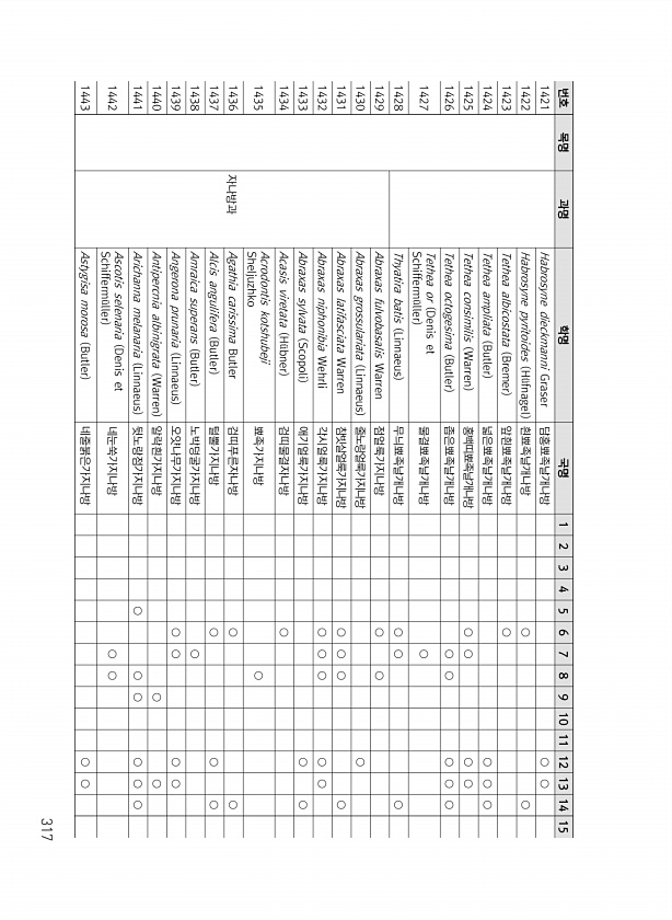 317 번호 목명 과명 학명 국명 1 2 3 4 5 6 7 8 9 10 11 12 13 14 15 1421 Habrosyne dieckmanni Graser 담홍뾰족날개나방 ○ ○ 1422 Habrosyne pyritoides H?fnagel 흰뾰족날개나방 ○ ○ 1423 Tethea albicostata Bremer 앞흰뾰족날개나방 ○ 1424 Tethea ampliata Butler 넓은뾰족날개나방 ○ ○ ○ 1425 Tethea consimilis Warren 홍백띠뾰족날개나방 ○ ○ ○ ○ 1426 Tethea octogesima Butler 좁은뾰족날개나방 ○ ○ ○ ○ ○ 1427 Tethea or Denis et Schifferm?ller 물결뾰족날개나방 ○ 1428 Thyatira batis ...