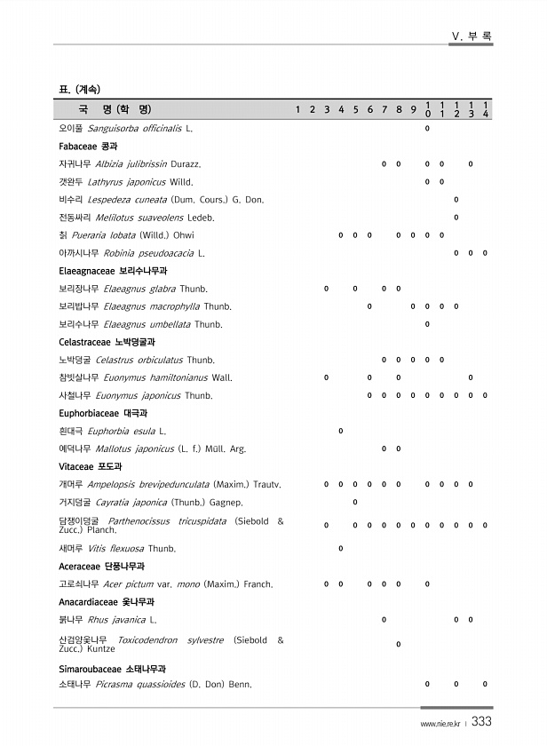 Ⅴ. 부 록 www.nie.re.kr ? 333 표. 계속 국 명 학 명 1 2 3 4 5 6 7 8 9 1 0 1 1 1 2 1 3 1 4 오이풀 Sanguisorba officinalis L. 0 Fabaceae 콩과 자귀나무 Albizia julibrissin Durazz. 0 0 0 0 0 갯완두 Lathyrus japonicus Willd. 0 0 비수리 Lespedeza cuneata Dum. Cours. G. Don. 0 전동싸리 Melilotus suaveolens Ledeb. 0 칡 Pueraria lobata Willd. Ohwi 0 0 0 0 0 0 0 아까시나무 Robinia pseudoacacia L. 0 0 0 Elaeagnaceae 보리수나무과 보리장나무 Elaeagnus glab...