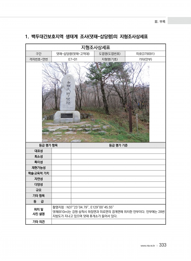 Ⅲ. 부록 www.nie.re.kr ? 333 1. 백두대간보호지역 생태계 조사 댓재삽당령 의 지형조사상세표 지형조사상세표 구간 댓재삽당령 댓재고적대 도엽명 도엽번호 미로 379091 격자번호-연번 E7-01 지형명 기호 기타 안부 등급 평가 항목 등급 평가 기준 대표성 희소성 특이성 재현가능성 학술?교육적 가치 자연성 다양성 규모 기타 항목 등 급 위치 및 사진 설명 촬영지점 N37°23′04.79″, E129°00′45.55″ 댓재 810m 는 강원 삼척시 하장면과 미로면의 경계면에 위치한 안부이다. 안부에는 28번 지방도가 지나고 있으며 댓재 휴게소가 들어서 있다. 기타의견