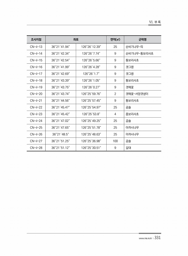 VI. 부 록 www.nie.re.kr ?331 조사지점 좌표 면적 ㎡ 군락명 CN-il-13 36°21′41.94″ 126°26′12.39″ 25 순비기나무-띠 CN-il-14 36°21′42.34″ 126°26′7.74″ 9 순비기나무-통보리사초 CN-il-15 36°21′42.54″ 126°26′5.66″ 9 통보리사초 CN-il-16 36°21′41.99″ 126°26′4.28″ 9 갯그령 CN-il-17 36°21′42.69″ 126°26′1.7″ 9 갯그령 CN-il-18 36°21′43.39″ 126°26′1.05″ 9 통보리사초 CN-il-19 36°21′43.75″ 126°26′0.27″ 9 갯메꽃 CN-il-20 36°21′43.74″ 126°25′59.76″ 2 갯메꽃-서양갯냉이 CN-i...