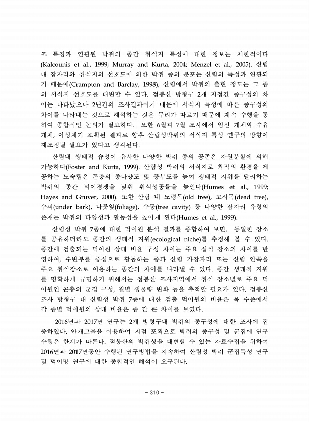 조 특징과 연관된 박쥐의 종간 취식지 특성에 대한 정보는 제한적이다 Kalcounis et al., 1999; Murray and Kurta, 2004; Menzel et al., 2005 산림 내 잠자리와 취식지의 선호도에 의한 박쥐 종의 분포는 산림의 특성과 연관되 기 때문에 Crampton and Barclay, 1998 , 산림에서 박쥐의 출현 정도는 그 종 의 서식지 선호도를 대변할 수 있다. 점봉산 방형구 2개 지점간 종구성의 차 이는 나타났으나 2년간의 조사결과이기 때문에 서식지 특성에 따른 종구성의 차이를 나타내는 것으로 해석하는 것은 무리가 따르기 때문에 계속 수행을 통 하여 종합적인 논의가 필요하다. 또한 6월과 7월 조사에서 임신 개체와 수유 개체, 아성체가 포획된 결과로 향후 산립성박쥐...